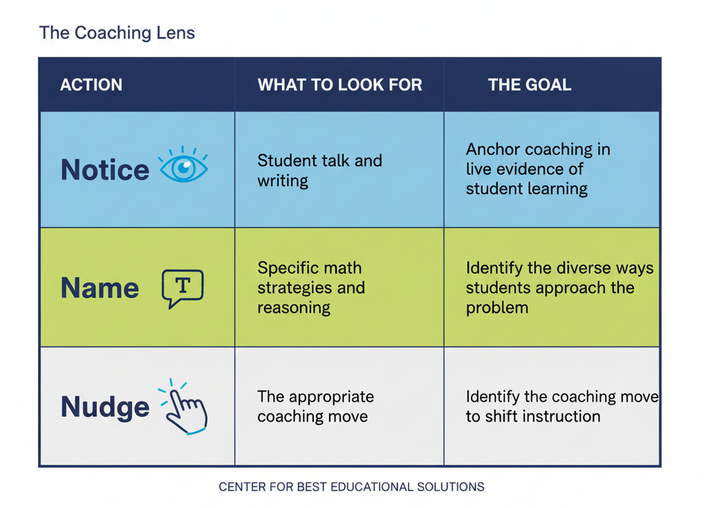 Adopt the "Notice, Name, Nudge" Framework: Anchor your coaching in "tiny in-the-moment moves" designed to notice what is happening, name it, and nudge the teacher forward